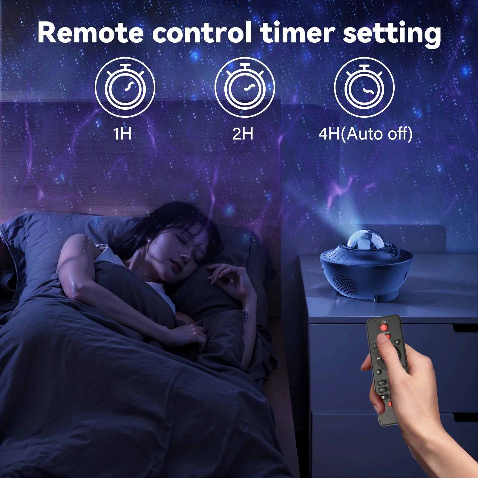 - Remote Control & Timer Setting⭐: The galaxy night light comes with a remote control and can be used within 16 feet. Whether you are sitting on the sofa or lying in bed, you can easily set your favorite atmosphere by adjusting the brightness, lighting mode, speed, music, and volume. By default, 4H automatically turns off to save energy. For your convenience, you can also set 1H/2H timing. (Note: The 2 3A batteries required for the remote control are not included in the product package.)