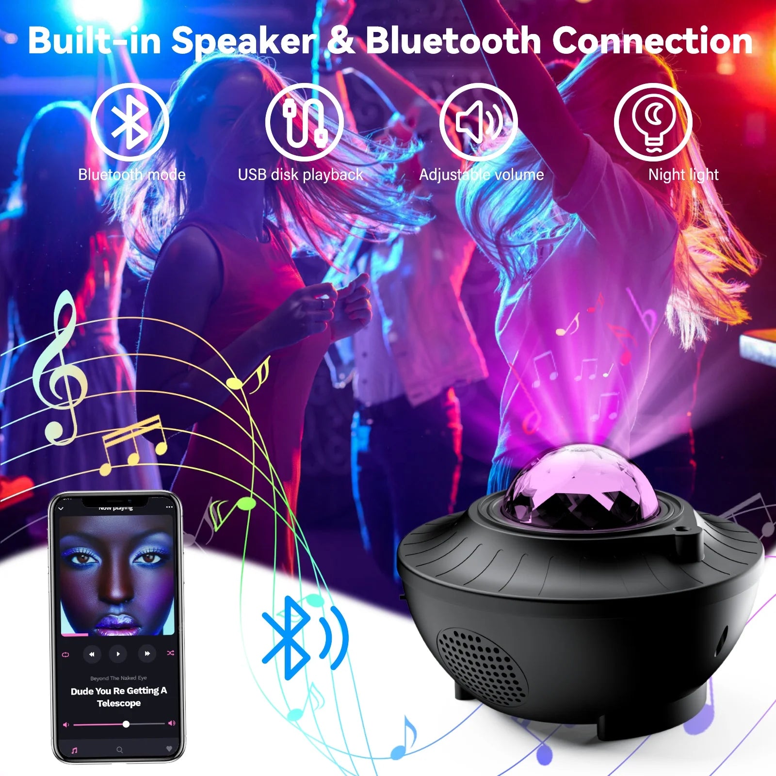 - Upgraded 4-in-1 Starlight Projector⭐: This galaxy projector for bedroom has been upgraded to a 4-in-1 version of a starlight projector, galaxy light, Bluetooth speaker, and night light. You can customize the light color, brightness, and speed to achieve thousands of different projector light effects, bringing you and your loved ones into a magical world. Imagine that colorful galaxy projectors are floating in your room, as if you are in the starry sky, mysterious and shocking.